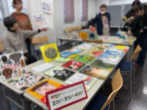 テーブルいっぱいに並べられた絵本は年齢の目安ごとに丁寧に分類されていて、どの絵本も実際に手に取って読むことができ、みなさま楽しまれていました。